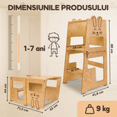 | Turn de invatare din lemn: Fabricat din lemn natural de inalta calitate, asigurand durabilitatea si sustenabilitatea produsului. | Turn de invatare ajustabil: Inaltimea scaunului este ajustabila, permitand adaptarea acestuia la inaltimea copilului, transformandu-se usor din scaun in masa. |