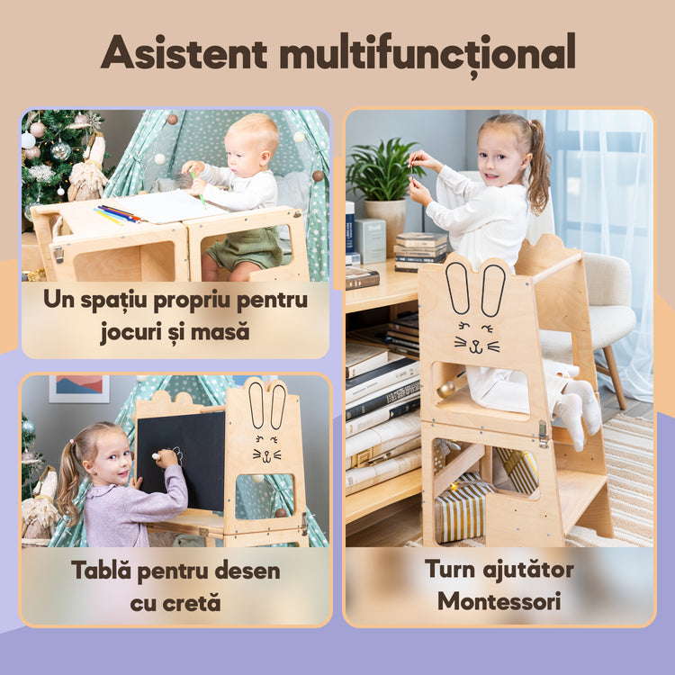 Turn de învațare, Bunny, tip Montessori, din lemn, cu tablă de desen